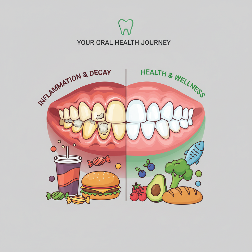 Esta ilustração mostra o contraste entre uma alimentação prejudicial (associada à inflamação gengival) e uma dieta protetora (associada a gengivas saudáveis), reforçando visualmente a mensagem do artigo.